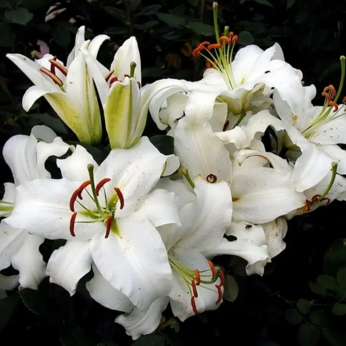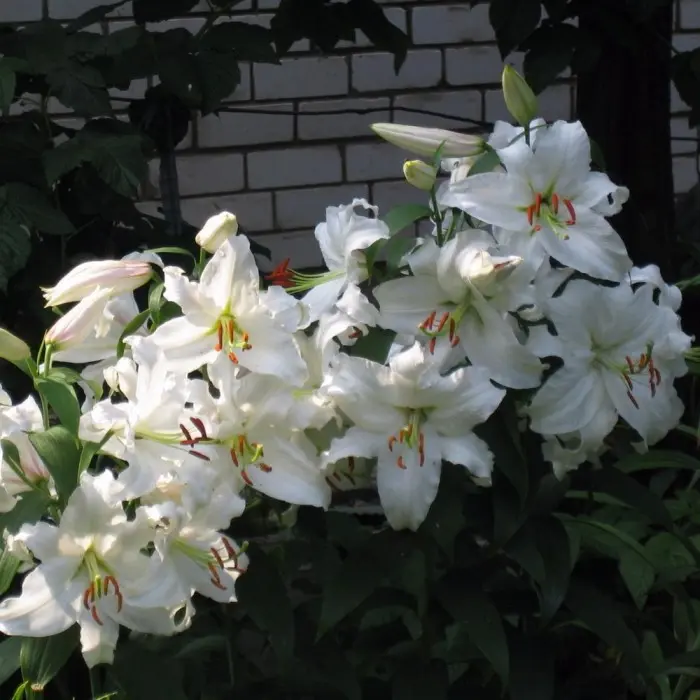 Лилия Siberia (разбор 12/14). Высота до 110 см. Цветки до 22 см в диаметре, чашевидные, белые. Края лепестков волнистые, кончики сильно загнуты. В соцветии 3-8 цветков, направленных вверх и в сторону. Сорт подходит для срезки. Очень красивый сорт, с приятным ароматом. Сорт зимостойкий.