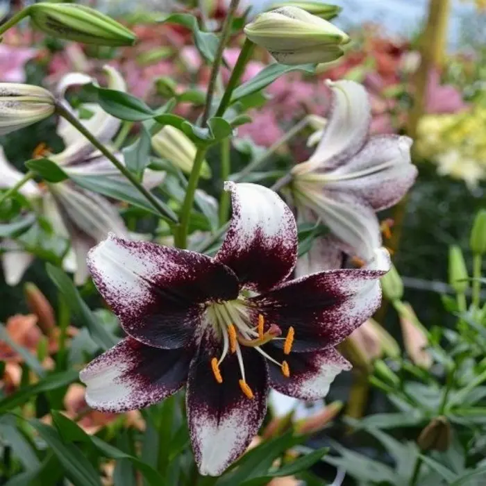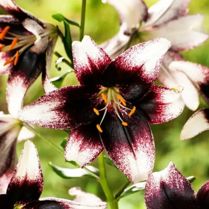Лилия Stracciatella Event (разбор 12/14). Куст плотный, лист узкий, зеленый. Цветки 20 см диаметром, воронковидные, одиночные или собраны в пирамидальные соцветия, расположены на конце цветоноса, лепестки цветка восковидной фактуры. Цветение обильное и продолжительное, декоративность сохраняется до конца осени. Высота растений 1,1 м, окраска цветка белая, пурпурное напыление, основание черное, центр чуть зеленовато-белый, пыльники оранжевые. Зона зимостойкости 4 (-35С).