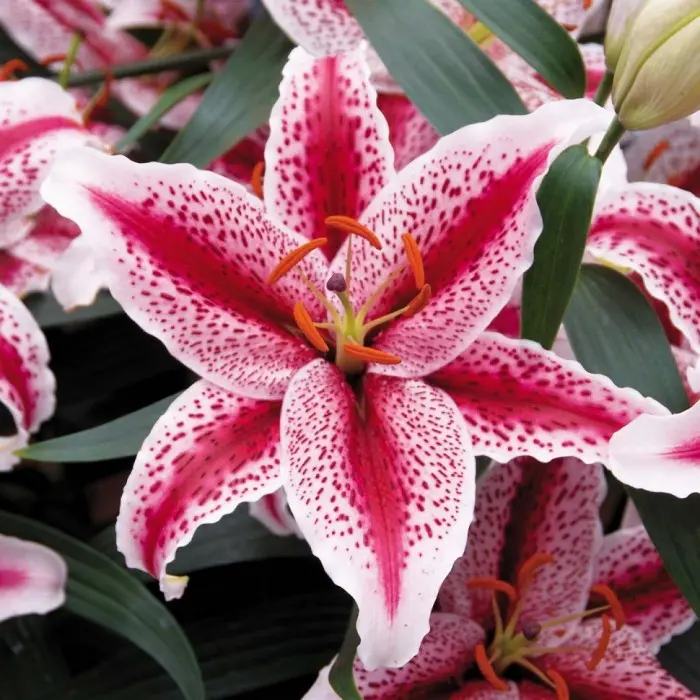 Разбор 12/14. Это фантастически красивая новая лилия, восточный гибрид, ее отличительной особенностью являются огромные цветы и благоухающий сладкий аромат. Белая лилия с широкой малиновой полосой почти до конца лепестков и густым малиновым крапом. Лепестки слегка волнистые, диаметр цветка 15-20 см, высота куста до 110-120 см.