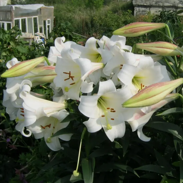 Лилия White Triumphator восточная. Разбор 12/14. Цветы красивые и ароматные. Бутоны колокольчиковой формы, направлены в сторону. Их лепестки изогнуты назад. Цветы, белого оттенка с насыщенно-розовым центром в диаметре до 25 см. Цветет в период с середины июля - начало август. Высота 90-120 см.