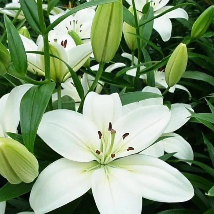 Лилия Yeti азиатская. Разбор 12/14. Одна из самых высокорослых азиатских лилий с самым продолжительным цветением среди азиатских лилий. Это очень большой, белый с лёгким намёком на жёлтый центре, но не ароматный цветок. Цветки крупные, диаметром 17 см, высота растения 110 см.