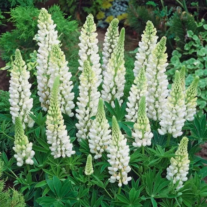 Люпин Noblemaiden. Прекрасный белоснежный сорт. Куст высотой около 90 см и в диаметре 50 см. Соцветия длинные, до 35 см. Матовые зеленые листья имеют пальчатую форму. Период цветения: июнь - июль. При условии обрезки увядших цветоносов может зацвести повторно в конце лета. Растение неприхотливое, растет практически на любой почве, полностью зимостойко.