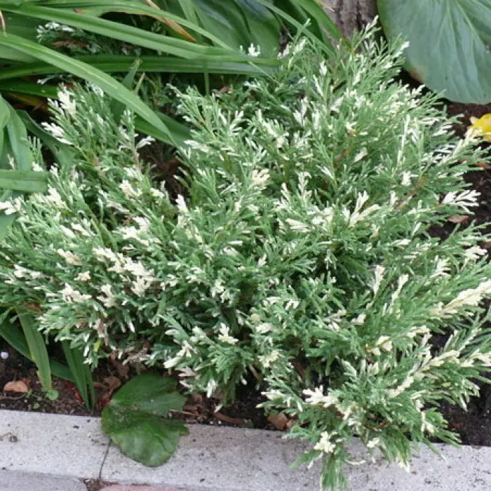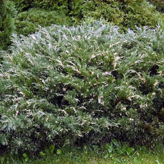 Можжевельник горизонтальный Andorra Variegata - карликовый кустарник с густой раскидистой кроной. Побеги растения расходятся от центра в стороны и имеют слегка приподнятый вверх кончик.