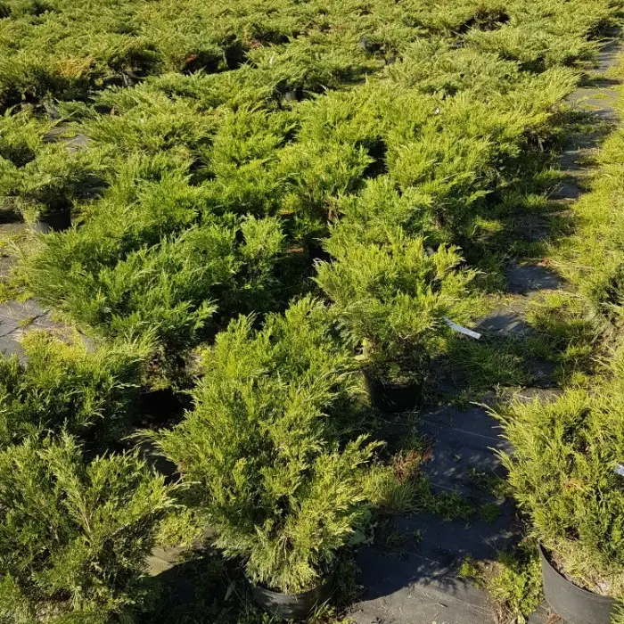 Ветки можжевельника покрыты мягкой густой хвоей светло-зеленого цвета. На кустарнике образуются многочисленные мелкие шишкоягоды зеленого цвета с голубым налетом. Плоды имеют шаровидную форму, не съедобны.