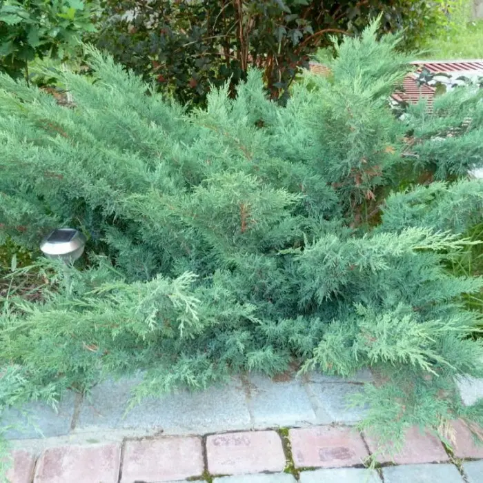 Можжевельник казацкий Glauca - декоративный кустарник с раскидистой густой кроной. Растение вырастает до 1м в высоту, а в диаметре разрастается до 3м. Ветви кустарника покрыты игольчатой хвоей сине-зеленого цвета. В зимнее время хвоя приобретает бронзовый оттенок.