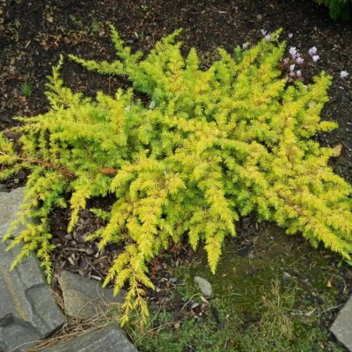 Ветви покрыты жесткой игольчатой хвоей золотисто-зеленого цвета. В зимнее время растение меняет свой окрас на более яркий цвет. Можжевельник не прихотлив, но лучше всего развивается на плодородной почве и на солнечных участках.