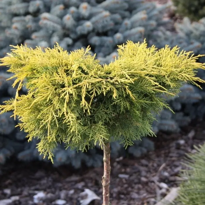Можжевельник средний Old Gold - декоративный кустарник с густой раскидистой кроной. Максимальная высота взрослого растения достигает до 1м, в диаметр крона разрастается до 2м. На ветках кустарника образуются плоды серо-голубого цвета с сизым налетом (содержат ядовитые вещества). Чешуйчатая хвоя зеленовато-желтого цвета с бронзовым оттенком. Не изменяет свой внешний вид круглый год.