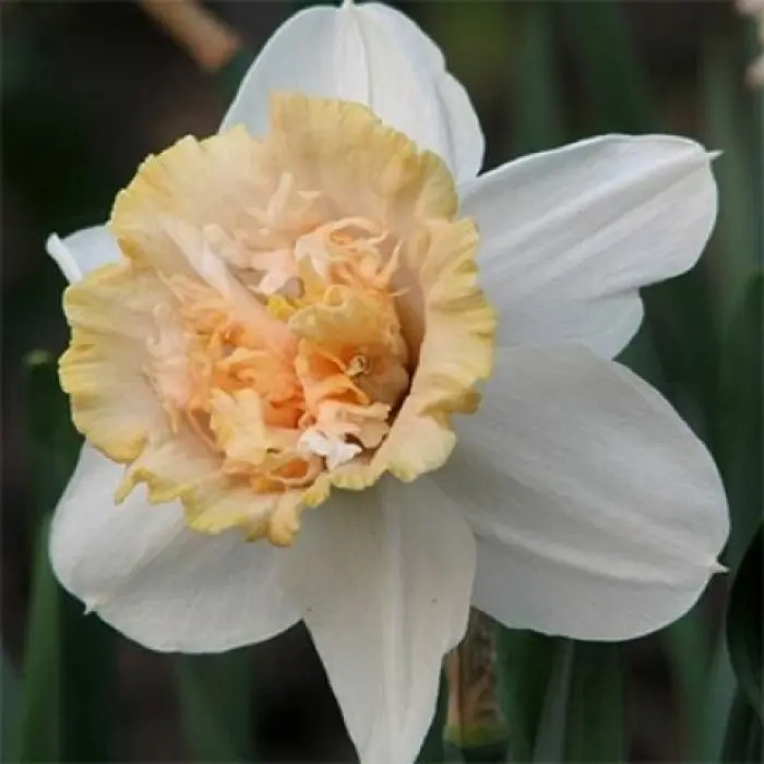Нарцисс махровый Petit Four. Махровый, многолетний сорт. Цветки с очень приятным, насыщенным ароматом, крупного размера, белоснежного цвета с гофрированной короной по центру розово-лососевого оттенка. Луковицы нарциссов среднего размера, отлично приживаются при любых климатических условиях. Растение неприхотливое в выращивании, стебель прямостоячий, крепкий.