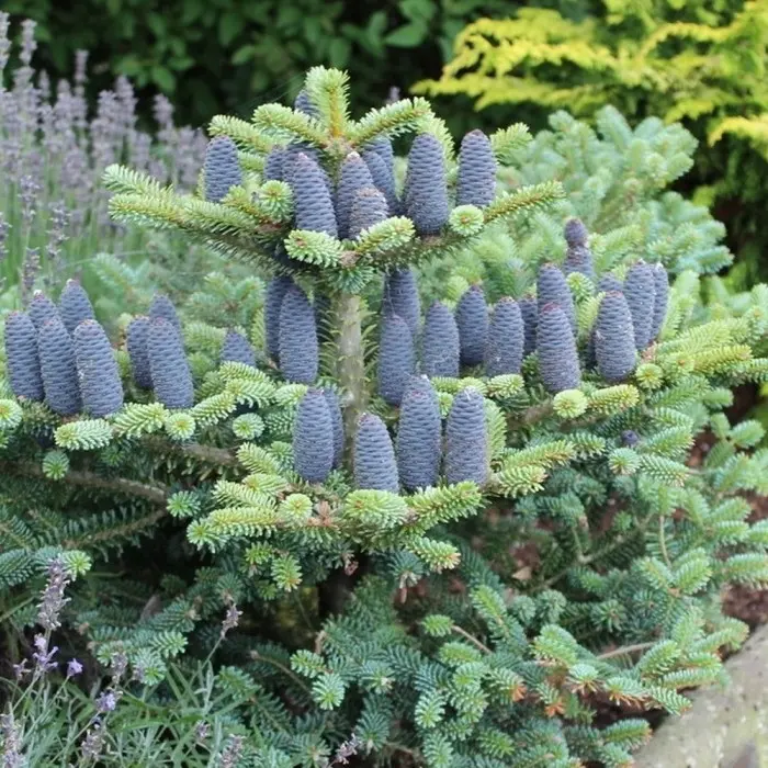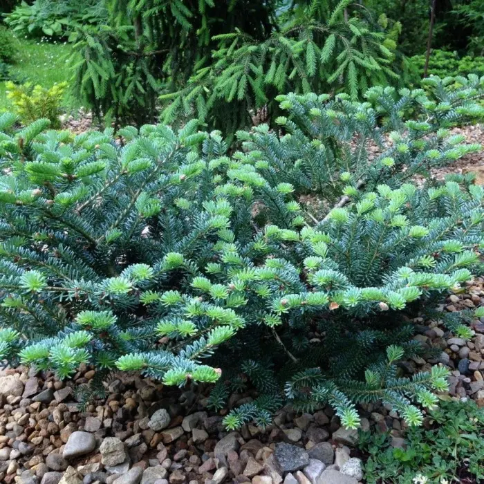 Пихта Koreana Blue Emperor. Низкорослый, вечнозеленый хвойник. Ствол плотный, прирост медленный 3-5 см, растение - природный карлик, достигшее взрослого возраста, при благоприятных условиях выращивания достигает 1,5 м. Крона сильноветвистая, округло - подушковидная, несимметричная, самоформируется, рост горизонтальный, позже образуется проводник, формируя широко-конусовидную форму. Побеги равномерные, серые, шероховатые. Хвоя игольчатая, окраска сине -зеленая, закручена , серебристо-голубоватая снизу, молодой прирост светлый. Зона зимостойкости 5.