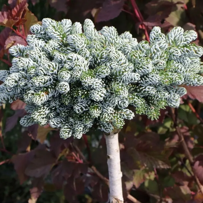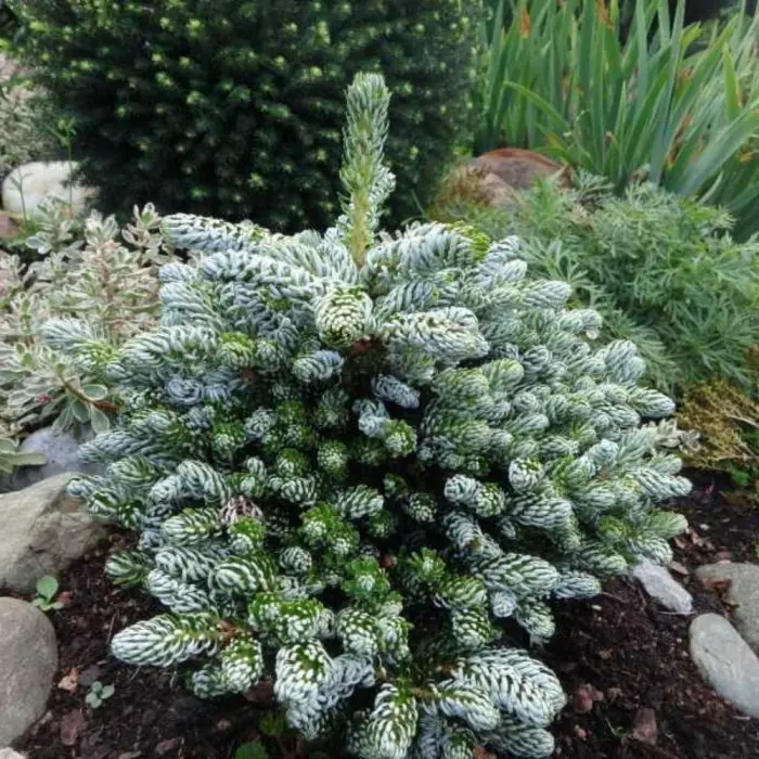 Пихта корейская Kohouts Icebreaker. Уникальный сорт. Карликовая форма, плоская, гнездовидная, красива в любое время года, к 10-ти годам высотой всего лишь 25 см и шириной 30-50 см. Взрослое растение (после 25 лет) высотой 50-80 см, шириной 80-120 см. Побеги короткие. Ветвление густое. Хвоя закручена снизу вверх так, что видна её нижняя серебристая сторона. Идеально подходит для альпинариев и каменных ванн.
