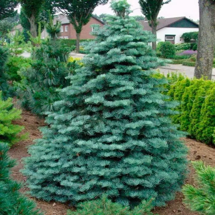 Пихта одноцветная. Высота 20 м, диаметр кроны 10 м. Шишки цилиндрические, на конце закруглённые. 8 - 15 см длиной и 3 - 5 см диаметром, сначала от зелёных до пурпурных. Созревшие светло-коричневые.