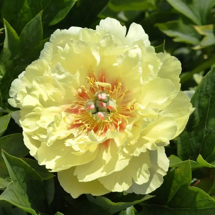 Пион ИТО-гибрид Garden Treasure. Листья крупные, сложные, дваждыперистые, насыщенно-зелёные или тёмно-зелёные, немного кожистые, чуть блестящие. Располагаются на крепких, прочных побегах.