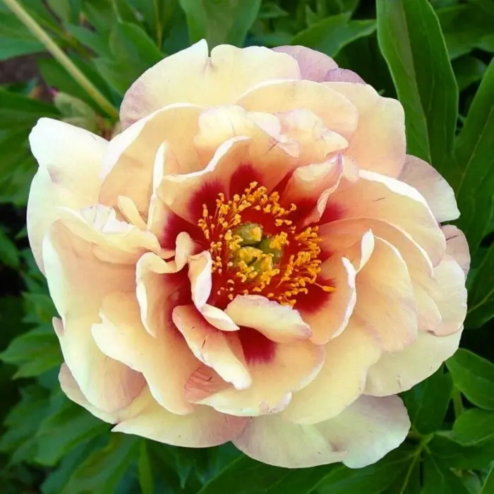 Пион ИТО-гибрид Magical Mystery Tour. Роскошный Ито-гибрид с большими цветками сливочно-персикового цвета с розовато-сиреневыми бликами и заметными вишнево-фиолетовыми пятнами у основания лепестков. К концу цветения лепестки светлеют до нежнейших оттенков слоновой кости и нежно-розовых оттенков. Зацветает в июне, цветение продолжительное и обильное. Взрослый куст дает за сезон 50 и более бутонов. Имеет приятный легкий аромат. Куст до 90 см высотой с прочными стеблями. Листва красивая, пышная, зелёного цвета. Не подвергается воздействию серой гнили.