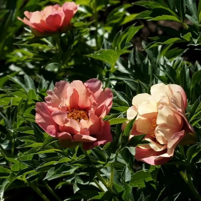 Пион ИТО-гибрид Old Rose Dandy. Цветки по форме напоминают раскрывшиеся тюльпаны. Оттенки лепестков переливаются от абрикосового до лососевого, с темно-красной звездой посередине. Высота взрослого куста – 80 см. Сорт прекрасно переносит морозные зимы и непродолжительную засуху. В длительную жару нуждается в поливе.
