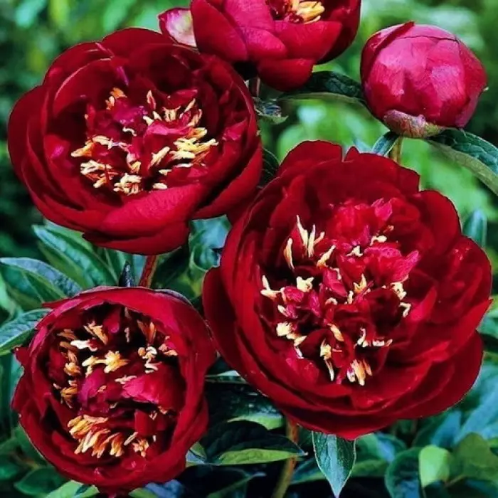 Особый полумахровый пион с исключительными цветами. Очень глубокий и темно-красный. Цветок очень темный, черновато-красный, пяти-шести рядный с крупными желтыми тычинками, которые подсвечивают его изнутри. Темно-зеленые листочки над красноватыми стеблями. Пион имеет особенный цвет, куст невысокий и компактный. Стебли прямые, прочные.