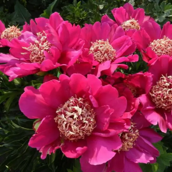 Пион молочноцветковый Barrington Belle. Форма цветка японская. Яркий розово-красный. Полумахровый. Наружные широкие лепестки, расположенные в один – два ряда, обрамляют узкие язычковые лепестки (стаминодии). Их ярко-малиновый цвет не позволяет оторвать взгляд от этого великолепного цветка. Стаминодии, загибающиеся к центру, украшены кремово-желтыми пятнышками на кончиках. Стебли крепкие красноватые. Листья темно-зеленые. Куст прекрасно держит форму, есть боковые бутоны, хорошо развивается. Аромат пряный. Период цветения: средне-ранний.