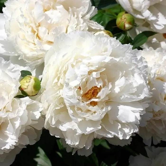 Махровый розовидный. Цветок диаметром 19 см, плотно набитый, бело-кремовый, нежно-переливчатый, с подсветом от колец тычинок. Аромат неопределённый. Куст высотой 80 см. Побеги сильные. Листья крупные, удлинённые, тёмно-зелёные. Среднего срока цветения. Один из самых красивых срезочных сортов.