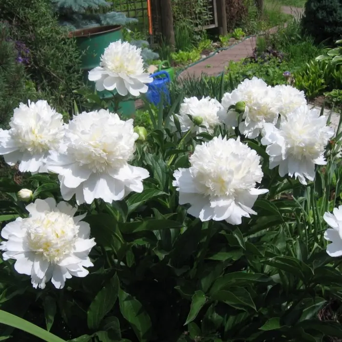 Пион молочноцветковый Charles White. Цветок густо - махровый, шаровидный, огромный, с закручивающимися лепестками, белый с легким оттенком слоновой кости. Относится к ранним сортам, зацветает одним из первых в мае. Куст высокий около 100см. Куст раскидистый, большого размера, нуждается в специальной опоре, которая будет поддерживать тяжелые шапки цветов, особенно в неблагоприятную погоду. У пиона присутствует тонкий аромат. Сорт обладает множеством достоинств: неприхотливый, зимостойкий, не восприимчив к болезням и вредителям. Огромный плюс пиона «Чарльза Уайта» заключается в его долговечности, срок жизни кустов исчисляется десятилетиями.