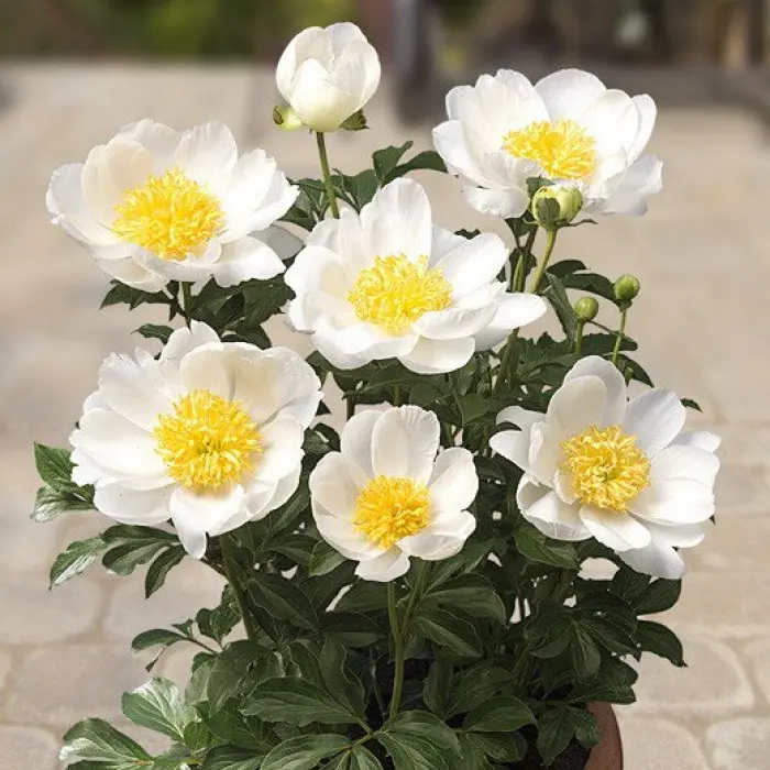Пион молочноцветковый Dublin. Молочноцветковый пион гибридного происхождения. Травянистый полукустарник. Эффектный пион «Дублин» из сортосерии Patio Peony. Это поздноцветущий сорт с великолепными цветками анемоновидной формы. Цветки белые, с желтым центром, очень напоминают яичницу-глазунью. Лепестки широкие, в цветке расположены в 1-2 ряда. Настоящих тычинок мало, весь центр цветка заполняют стаминодии. Цветоносы крепкие. Куст компактный. Листья дважды тройчатые, заостренные, выглядят отлично на протяжении всего сезона. Патио Пионы очень подходят для горшечного садика, благодаря компактному росту и дружному цветению. Они красиво смотрятся в цветниках, на переднем плане в кустарниковых бордюрах и в горшках. Оптимальный размер горшка – 35-55 см в диаметре. Местоположение – полное солнце или полутень.