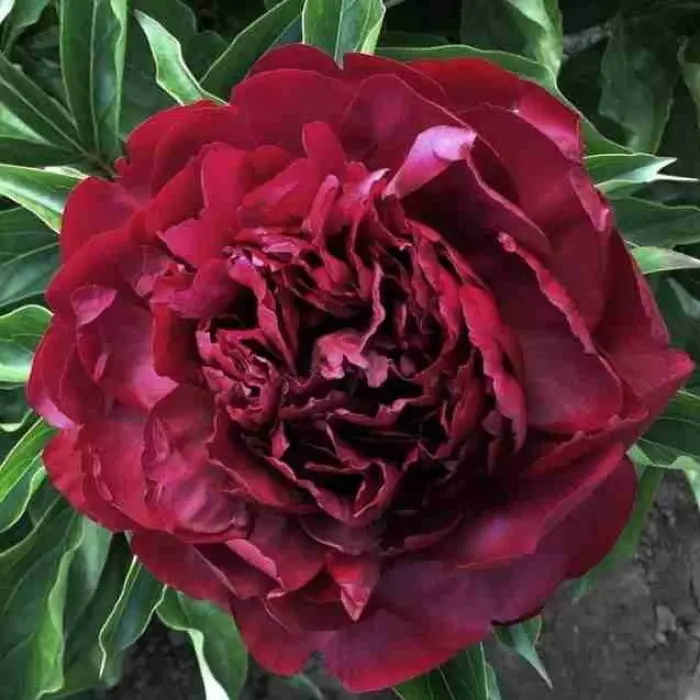 Махровый полушаровидный. Цветок крупный, диаметром 19 см, прекрасной формы, очень тёмно-красный блестящий. Лепестки плотные, загнуты внутрь. Тычинки прячутся между лепестками. Пестики маленькие, белые с бледно-розовыми рыльцами. Высота 75 см. Стебли прочные. Листья крупные, блестящие. Срок цветения средний.