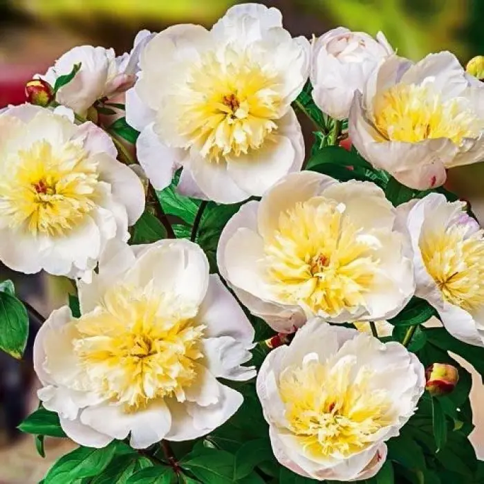Пион молочноцветковый Madrid относится к молочноцветковой группе, гибрид, является травянистым полукустарником. Очень красивый атрибут любого сада, компактный, имеет набивные заостренные листья и цветы. Данный сорт относится к позднецветущему. Цветки с нежным ароматом, полумахровые, лепестки двурядовые, крупные. Диск в центре цветка имеет ободок из тычинок. Пион отлично смотрится как горшечное растение в цветниках, так и вдоль бордюров.