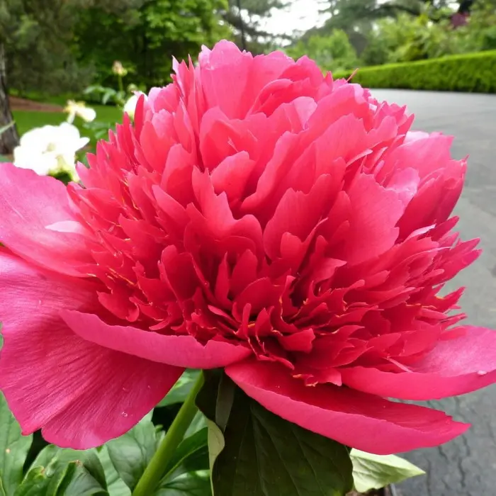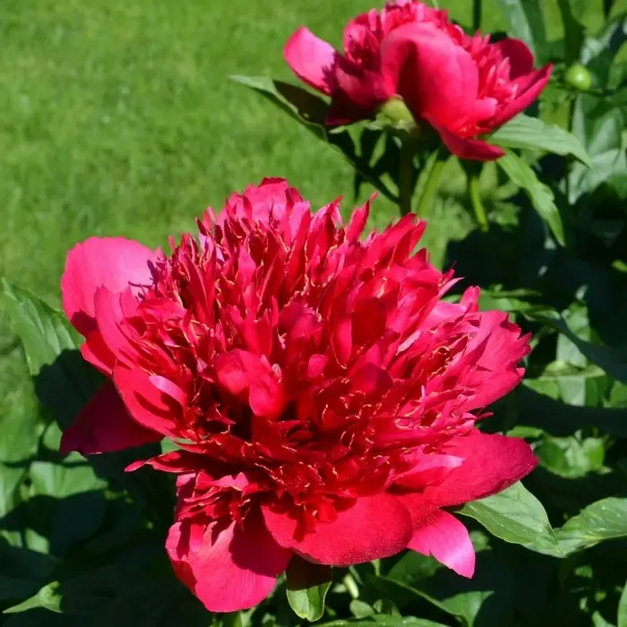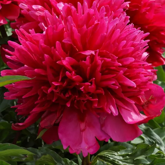 Пион молочноцветковый Many Happy Returns. Высота растения 75 - 90 см. Цветы махровые, анемоновидной формы, диаметром 17 см. Цвет - ярко-красный. Внешние лепестки крупные, внутренние – узкие, длинные, похожие на пламя огня. На внутренних лепестках иногда бывают желые искорки. Аромат легкий, нежный.