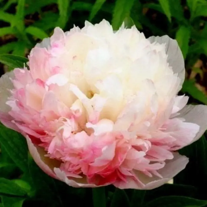 Высота растения 60 см. Срок цветения ранний. Цветки бело-розовые, к концу цветения выгорают до белого с неравномерным розовым оттенком на лепестках. Соцветия пышные, плотные. Лепестки с волнистыми краями придают соцветиям изящество и пышность. Куст мощный и высокий, быстро разрастается. Аромат слабый.