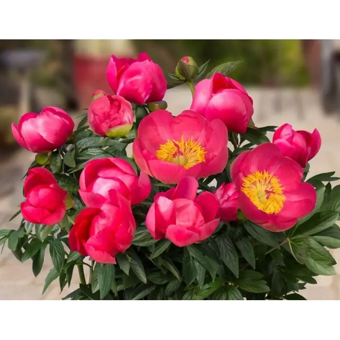 Пион молочноцветковый Oslo. Это очень ранний сорт с великолепными простыми цветками. Они розового цвета с алым отливом и с желтой серединкой. По форме цветка и окрасу очень напоминают мак восточный. Лепестки крупные, широкие, расположены в 1-3 ряда. Центральный диск окружен пестиками и тычинками, обычно стерильными. Цветки обращены вверх и хорошо видны. Обладают приятным сладким ароматом. Куст компактный. Цветоносы крепкие. Листья дважды тройчатые, заостренные, выглядят отлично на протяжении всего сезона. Патио Пионы неприхотливые растения. Они подходят для горшечного садика, благодаря компактному росту и дружному цветению. Также красиво смотрятся в цветниках, альпинариях и каменистых садиках, на переднем плане в бордюрах и в горшках. Оптимальный размер горшка – 35-55 см в диаметре.