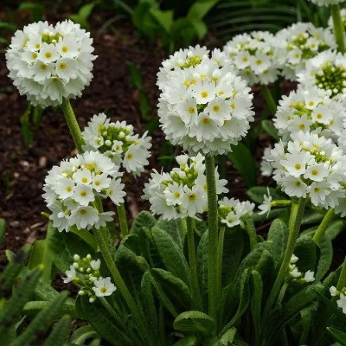 Примула мелкозубчатая или первоцвет мелкозубчатый белый отличается своими плотными округлыми соцветиями. Это один из самых красивых видов примулы. Высота растения 30 см. Листья широкие, продолговато-овальные, морщинистые, зазубренные по краям. Длина листьев 20-40 см. Цветки белые, диаметром 1,5 см собраны в шаровидные соцветия. Соцветие плотное диаметром до 10 см. Цветоносы крепкие, толстые, высотой 20-40 см, с мучнистым налетом. Цветет примула мелкозубчатая в апреле-мае, на протяжение 30-40 дней.