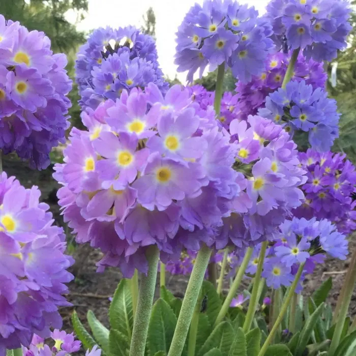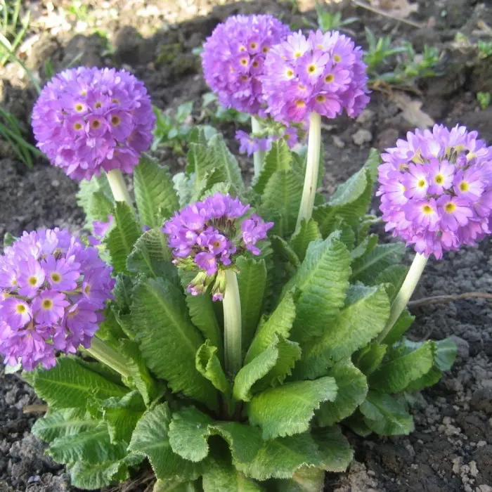 Примула мелкозубчатая Prom Lilac. Цветет пятилепестковыми цветками-чашечками, собранными в плотные шарообразные соцветия размером 4-5 см в диаметре. Цветки нежно-сиреневые, с желтым глазком внутри, располагаются на длинных цветоносных стеблях. Листья овальные, продолговатые, светло-зеленого цвета, собраны в аккуратные прикорневые розетки. Одно растение может одновременно выгонять до 10-12 цветоносов. Период цветения – с апреля до середины мая. Высота взрослых экземпляров – 25-30 см.
