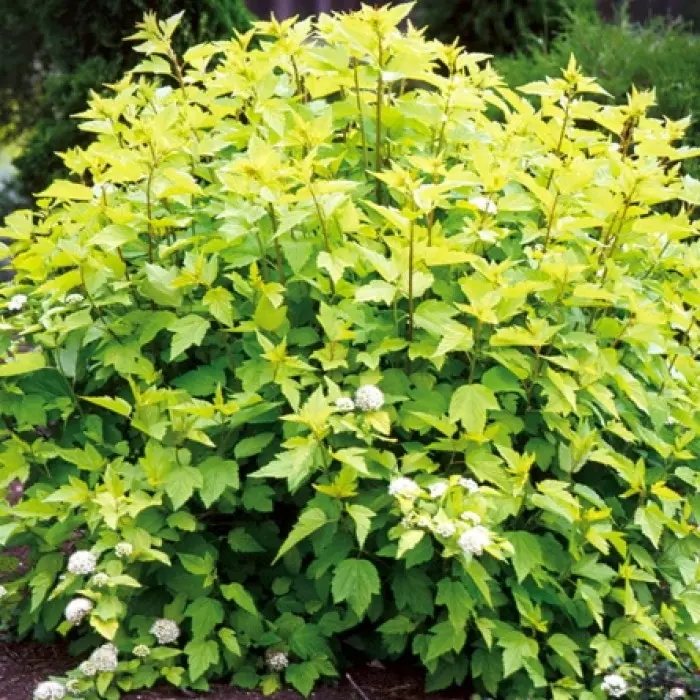 Пузыреплодник головчатый Tilden Park цветет летом. Цветочки собраны в соцветия белого цвета. Сентябрь-время созревания плодов.