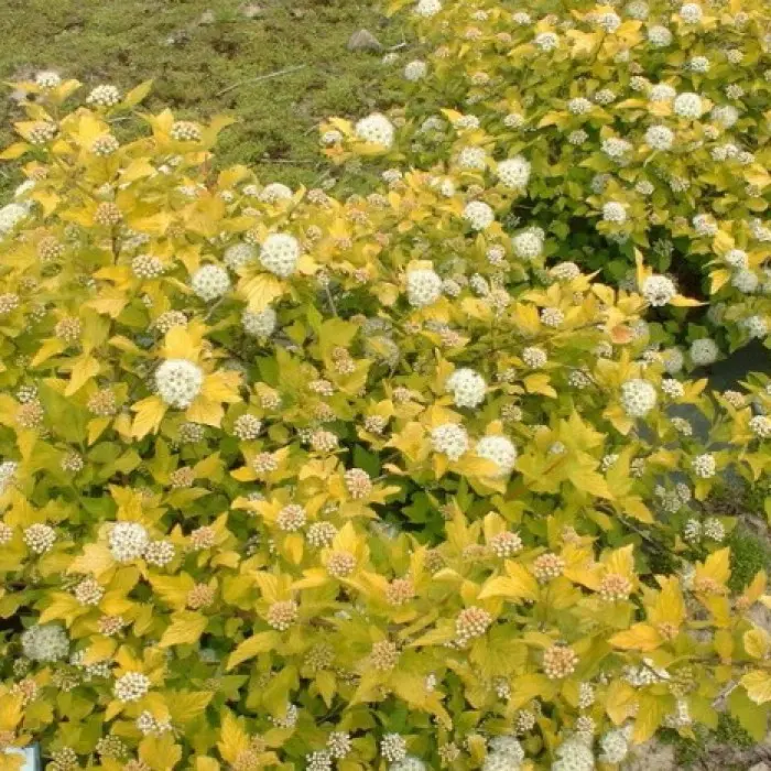 Пузыреплодник калинолистный Darts Gold. Среди большого количества декоративных растений только некоторые могут похвастаться абсолютной неприхотливостью и высокой декоративностью. К таким растениям относится и пузыреплодник калинолистный. Выращивают это растение из-за его эффектного вида: шаровидная густая крона из раскидистых поникающих ветвей с крупными гофрированными листьями выглядит пышно сверху донизу. Пузыреплодник калинолистный Dart's Gold вырастает до 1,5 м, листья при распускании оранжево-желтого цвета, летом немного зеленеют, а осенью желто-бронзового оттенка. Весной на нем появляются кисти белых или слегка розоватых цветков. По сути, этот сорт является усовершенствованной формой luteus, так как имеет значительно более яркую желтую листву и сохраняет этот привлекательный цвет весь летний сезон. Зона зимостойкости: 4 (-35 ° С)
