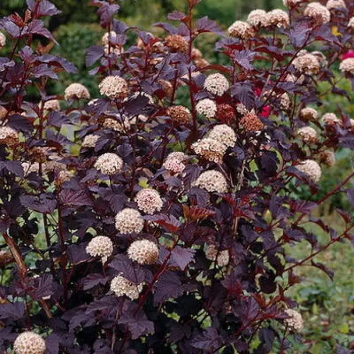 Пузыреплодник калинолистный Diabolo. Раскидистый кустарник высотой до 3 м с вертикально-растущими побегами. Кора на старых ветках отслаивается полосками. Листья пурпурные, равномерно окрашенные, 3-5 лопастные с более крупной вытянутой средней долей. Осенью окраска практически не меняется, только становится чуть светлее. Цветки мелкие, розовато-белые, собраны в плотные щитковидные соцветия, появляются в начале июня.