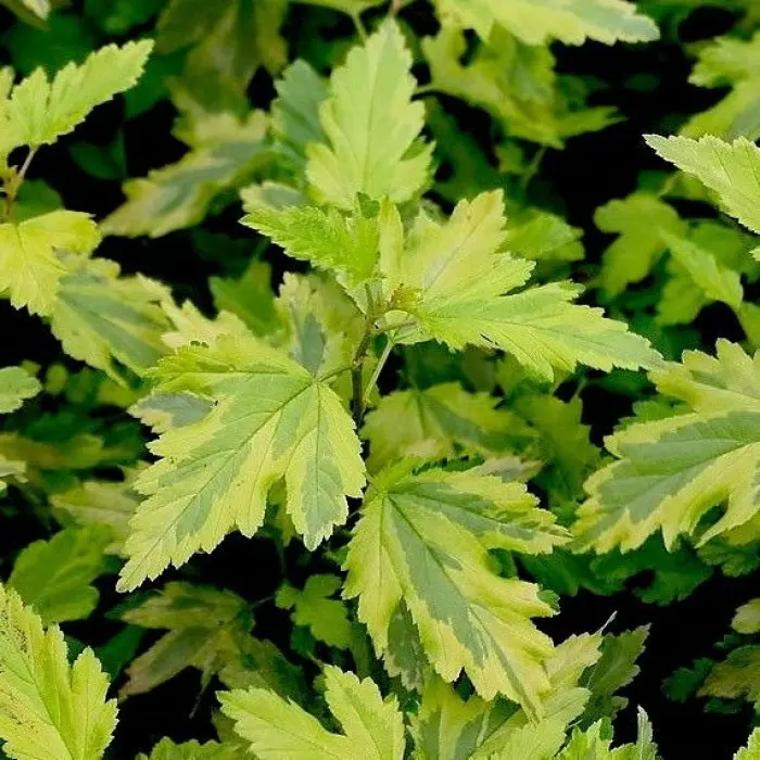Пузыреплодник калинолистный Anny's Gold. Кустарник высотой и шириной до 1,5 м. Компактный, очень плотный, быстрорастущий куст с густой полушаровидной кроной. Декоративен в течение всего сезона. Весной, когда куст покрывается только распускающимися листьями, это напоминает буйное цветение форзиции. Летом листва пестрая, на одном кусту листья нескольких оттенков - желто-зеленые полосатые, ярко-желтые, зеленые. Зацветает в июне. Цветы кремово-белые с переходом в розовый оттенок, с красными тычинками. Они покрывают весь куст, придавая ему особый шарм. Красив куст и в период плодоношения. Плоды шаровидные, очень эффектны, по мере созревания меняют окраску от светло-зеленой до красноватой. К почвам не требователен. Засухоустойчив, но предпочитает увлажненные почвы. Посадка на освещенных, защищенных от ветра местах с влажными, дренированными почвами. Зона зимостойкости 3 (до -34°С).