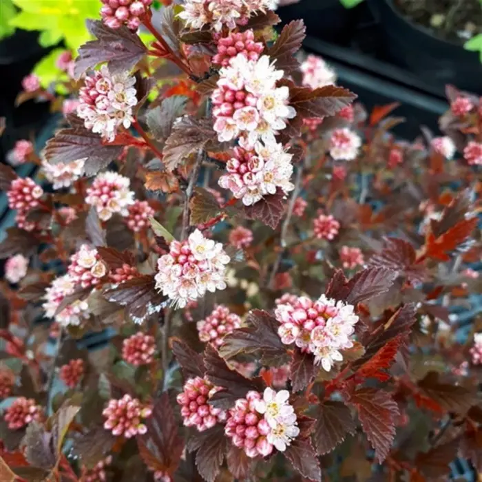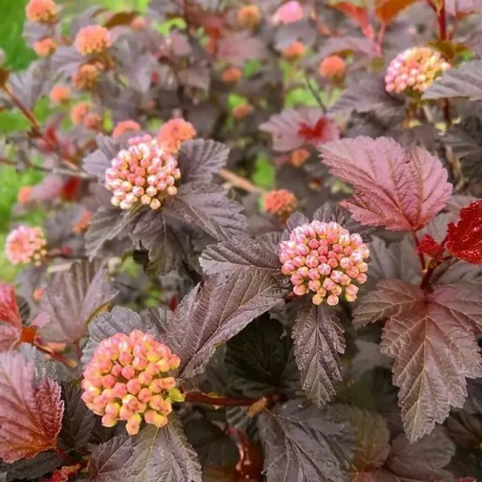 Пузыреплодник калинолистный Magical Sweet Cherry Tea. Растение достигает высоты около 120 см и имеет ширину примерно 100 см. Крона данного пузыреплодника густая и имеет шаровидную форму. Растение сильноветвистое, а побеги прямостоячие и сильные. Листья обладают интересной окраской: при распускании они оранжево-красные, летом становятся пурпурно-бордовыми, а осенью приобретают бордово-красный оттенок. Молодые листья также имеют оранжево-красную окраску. Цветы имеют нежно-розовую или розовато-белую окраску. Цветение этого сорта начинается в мае и продолжается до июля, возможно повторное цветение в августе. Для успешной посадки пузыреплодника необходимо выбирать место солнечное или с легкой полутенью. Растение предпочитает различные типы почв, такие как суглинистая, супесчаная, плодородная, песчано-суглинистая и торфяная. Кислотность почвы может быть нейтральной, слабощелочной, слабокислой или кислой.