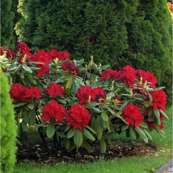 Рододендрон Гибридный Francesca. Вечнозелёный кустарник, растёт быстро, к 15-ти годам высота 150 см, диаметр кроны 180 см. Цветки 5,5х7 см, открытые, тёмно-красные, с волнистой каймой. Соцветие огромное, состоит из 17-26 цветков. Цветение приходится на конец мая - середину июня. Рекомендуется сажать в полутенистом месте для сохранения окраски цветков во время всего периода цветения.