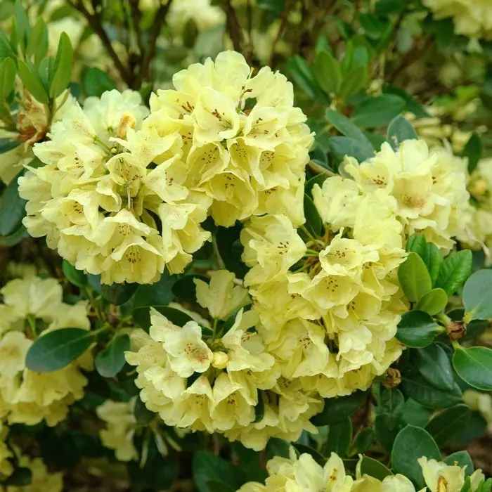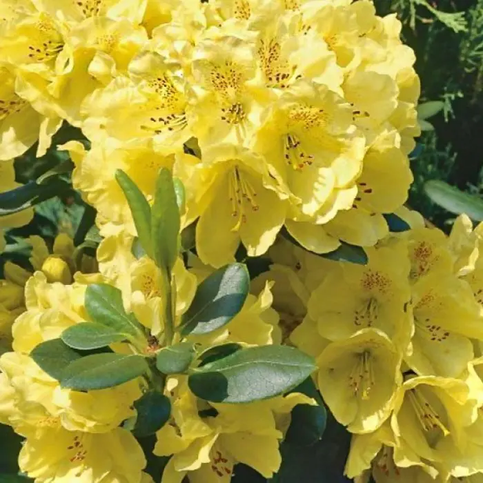 Рододендрон Гибридный Goldkrone. Вечнозеленый кустарник. Медленнорастущий. Через 10 лет достигает 0,80 м в высоту и 1,10 м в ширину. Цветки желтые, внутри лимонно-желтые с коричневыми крапинками на центральном лепестке. Период цветения – май. Листья темно зеленые. Зона зимостойкости 5.