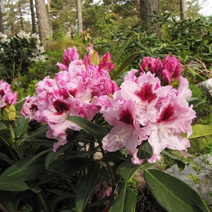 Рододендрон Гибридный Krolowa Jadwiga. Сорт из группы Королевских Рододендронов с высокой морозостойкостью и обильным цветением. Цветки розово-белые, сильно изрезанные, с большим красно-бордовым пятном. Цветение очень обильное, куст в это время словно покрыт нежной розовой пеной. Цвести начинает в начале июня и длится 2-3 недели. Листья продолговатые, темнозеленые, длиной до 12 см.