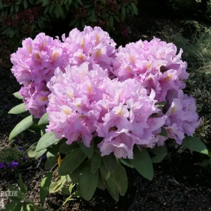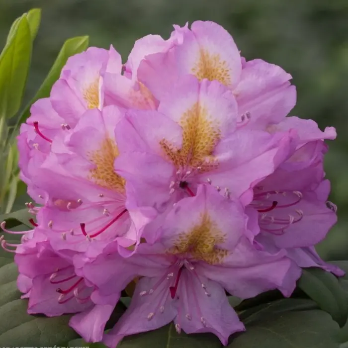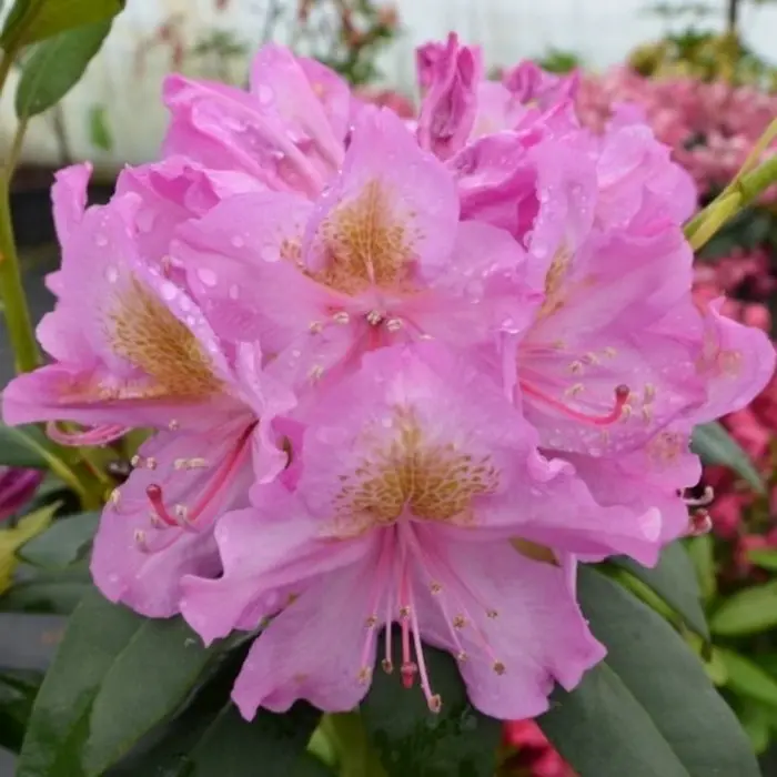 Рододендрон Гибридный Late Kiss. Очень поздний сорт рододендрона - цветет в июне. Цветение обильное. Бутоны светло-зеленые, крупные, высокие. Форма куста плотная, прямая. Цветки крупные, розовые с ярко выраженным желто-коричневым рисунком. Достигает высоты 1,5 м через 10 лет. Морозостойкость (без укрытия) до -24?С.