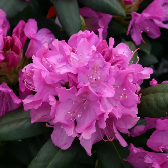 Рододендрон гибридный Roseum Elegans. Вечнозеленый, медленнорастущий полушаровидный кустарник. Цветки розовые с нежным красновато-коричневым пятнышком (до 7 см ), широковоронковидные, по краю слегка волнистые, собраны по 15 штук в компактные соцветия. Цветет в начале июня в течение почти 3 недель, предпочитает хорошо дренированные кислые почвы, среднеосвещенные участки.