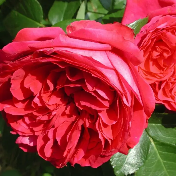 Роза английская Tess of the Durbervilles. Цветок темно-малиново-красный, чашевидный, края внутренних лепестков загнуты внутрь цветка, густомахровый (75 - 80 лепестков), обладает насыщенным ароматом старой розы. Цветение очень обильное, продолжительное, цветки собраны в небольшие соцветия. Растение сильнорослое с поникающими побегами. Лист темно-зеленый, крупный, полуглянцевый. Высота куста 90 см, ширина куста 125 см. Диаметр цветка 12 см.