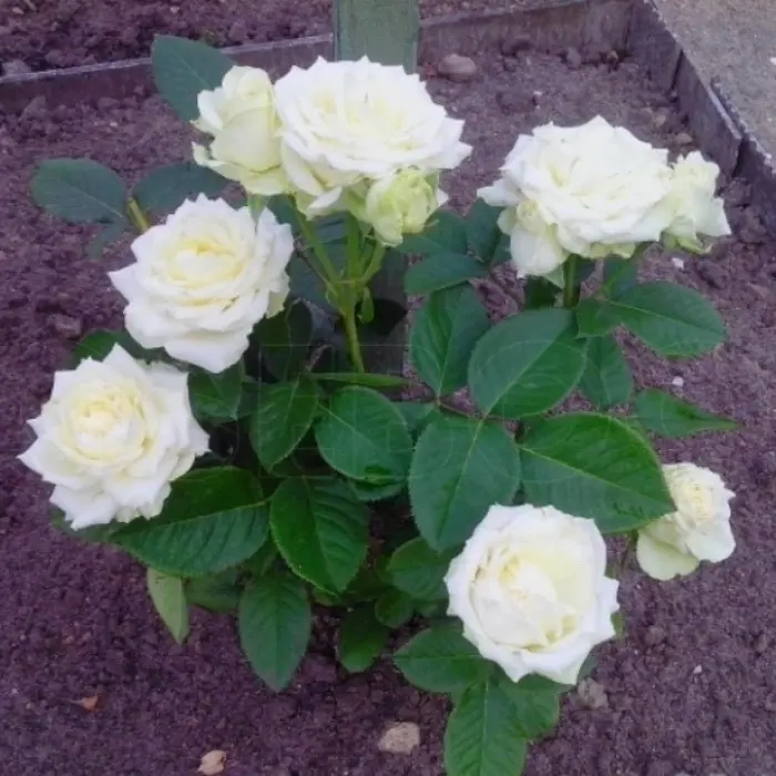 Роза чайно-гибридная Avalanche. Белые, средне-махровые (17-25 лепестков) цветки, в полуроспуске - классической формы чайно-гибридной розы с высоким центром, в полном роспуске - свободной, открытой чашевидной формы на побегах - одиночные. Куст вертикальный, со средне-зеленой, матовой листвой. Высота куста 80 см, ширина 50 см. Размер цветка 8-10 см.