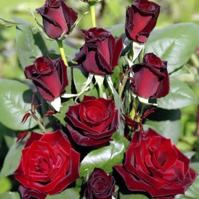 Роза чайно-гибридная Barcarola. Цветки этого сорта бокаловидные, с длинными изящными лепестками. Это одна из самых темных роз, выведенных на настоящий момент. Аромат средний. Цветение продолжается все лето и осень, довольно обильное, и потому сорт очень популярен. Куст высокий, сильнорослый, неровной высоты. Хорошо стоит в срезке. Высота куста: 70-100 см, ширина 80 см. Диаметр цветков: 7-8 см.