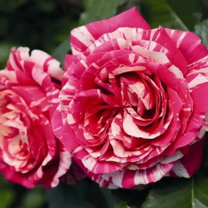 Роза чайно-гибридная Best Impresion. Чашевидные цветки насыщенно-розового цвета в светло-розовую полоску. На побегах как одиночные, так и в соцветиях до 3 штук. Размер цветка: 8-10 см. Повторноцветущая.