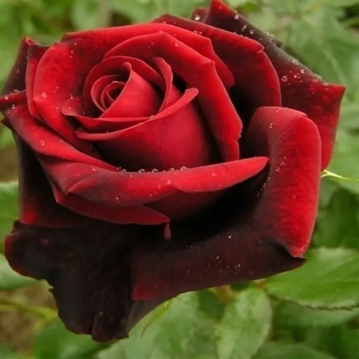 Роза чайно-гибридная Elegia. Цветки темно-бархатные, до черноты, бокаловидные, махровые, средние, ароматные, на тонких прочных стеблях. Кусты средние, с тонкими, но сильными побегами. Листья темно-зеленые, глянцевитые. Цветение продолжительное, размер цветка 8-9 см. Высота куста 70-90 см. Устойчив к погодным условиям. Пригоден для групп и срезки.