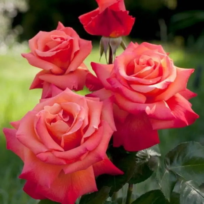 Роза чайно-гибридная Christophe Colomb. Цветки алого цвета, с желтой подсветкой на оборотной стороне лепестков. Лепестки очень широкие. Цветки имеют классическую форму чайно-гибридных роз, но обычно появляются в кистях по 3-7 шт, по одному лишь изредка. Листва крупная, блестящая, темно-зеленая. Куст очень колючий, сильнорослый. Диаметр цветков 11-12см. Высота куста 120-150 см, ширина 120 см. Аромат слабый. Роза повторноцветущая.