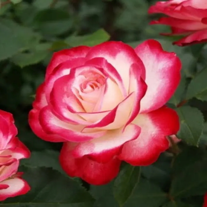 Роза чайно-гибридная Fair Lady. Цветки элегантные, двуцветные, в основном одиночные с приятным ароматом. Внутренние лепестки кремово-белые, внешние - вишнево-красные, при отцветании более тёмные. Диаметр цветков:7-10 см. Высота куста: 90-120 см. Ширина куста: 70-100 см. Листва блестящая, тёмно-зелёная. Устойчивость к заболеваниям: черной пятнистости - высокая, мучнистой росе - высокая. Зона зимостойкости: 5 (-29 °С)