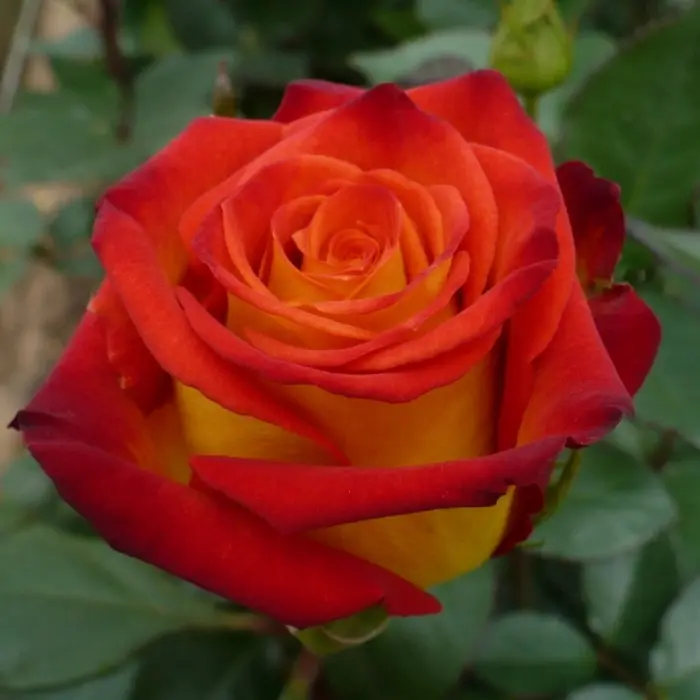 Роза чайно-гибридная Friendly — сорт, отличающийся необыкновенно яркими цветками классической формы. Лепестки желтые с красноватой каймой, не выгорают на солнце, не теряют декоративности от сильных осадков. Кусты средней высоты 100-120см, шириной 80 см, размер цветка