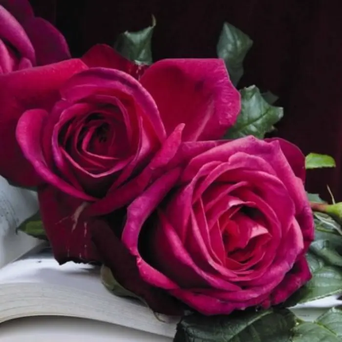 Роза чайно-гибридная Johann Wolfgang von Goethe. Цветки диаметром 12-15 см, пурпурно-фиолетовые, источают сильный, насыщенный аромат благородных роз. Куст округлой формы с короткими, компактными цветоносами. Листва средне-зелёная с синеватым налётом, поразительно крепкая, устойчивая к мучнистой росе, полностью устойчивая к чёрной пятнистости. Рекомендуется для посадки с другими ароматными розами в классических «садах ароматов» и для срезки в вазы. Высота 100-120 см.