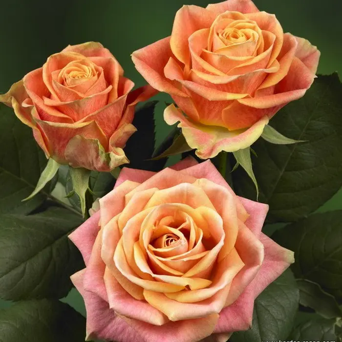 Роза чайно-гибридная Marakuja. Махровые, с 17-25 лепестками, абрикосовые цветки диаметром около 10 см с розоватыми нижними лепестками. Повторноцветущая. Куст высотой 80 см, ширина 60 см. листва темно-зеленая. Средняя устойчивость к мучнистой росе и черной пятнистости. Хорошо подходит для срезки.